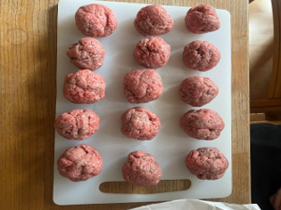 Bereiten Sie eine Arbeitsfläche, das Fleisch und ein Schneidebrett vor. Formen Sie das ganze Fleisch in feste & handflächengroßen Kugeln. Legen Sie die geformten Laibchen auf das Brett.