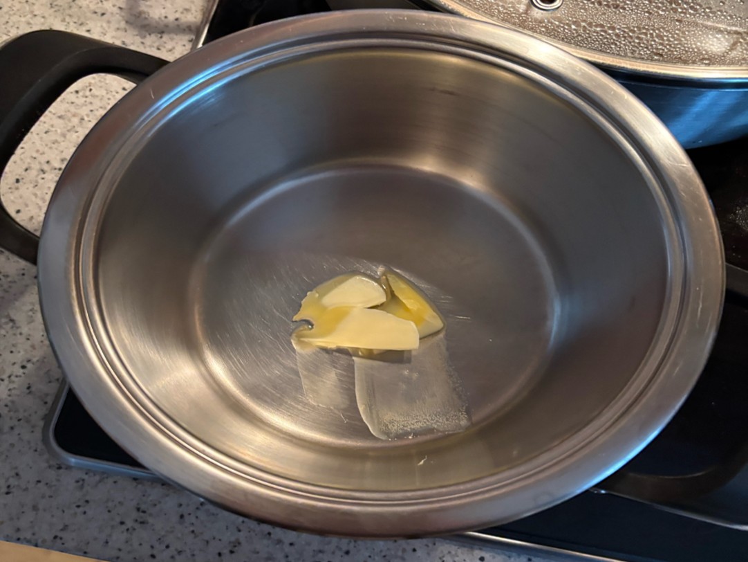 Lassen Sie in einem Topf mit Deckel ca. 5-10 Gramm Butter schmelzen und geben Sie 20 Gramm Wasser dazu.