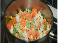 Legen Sie das Tiefkühl-Gemüse in den Topf und rühren Sie kräftig um. Lassen Sie danach das Gemüse bei niedriger Hitze (Herdstufe 3) für 8 Minuten mit dem Deckel auf dem Topf köcheln.