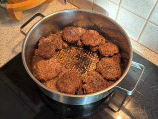 Schlichten Sie danach die fertigen Laibchen am Rand der Pfanne ein (wenn notwendig auf mehrere Lagen stapeln). Lassen Sie die Laibchen bei kleiner Hitze (Herdstufe 1 oder 2) schmoren und platzieren Sie den Deckel auf der Pfanne.
