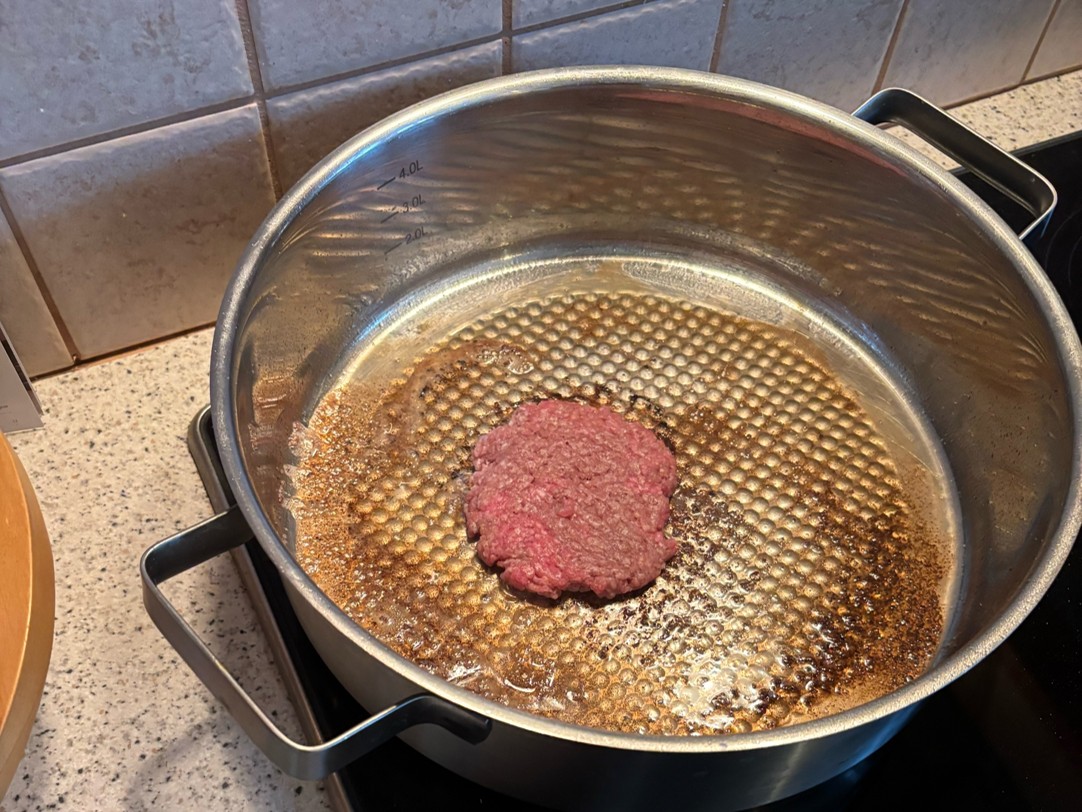 Lassen Sie in einer Pfanne Butter schmelzen (20g). Braten Sie die Fleischlaibchen kurz bei hoher Hitze (Herdstufe 9) an.