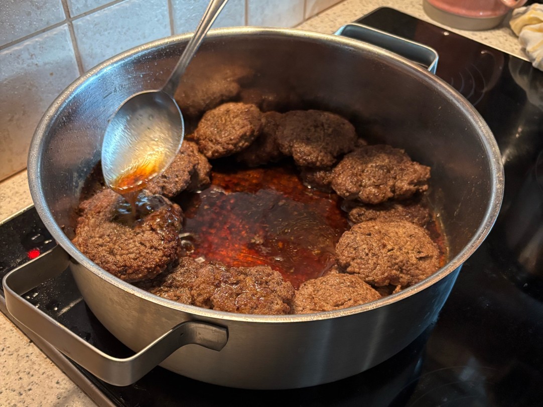 Übergießen Sie die Laibchen alle 10 min für 2 Stunden lang mit dem Saft, der sich in der Pfanne ansammelt.