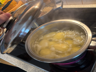 Geben Sie die geschälten Kartoffeln in das kochende Salzwasser. Legen Sie den Deckel auf den Topf. Lassen Sie die Kartoffel kochen, bis sie gar sind (ca. 15 Minuten).