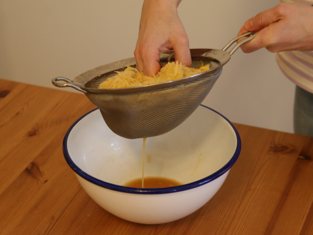 Geben Sie die geriebene Erdäpfelmasse in ein Sieb und drücken Sie sie gut mit den Händen aus.