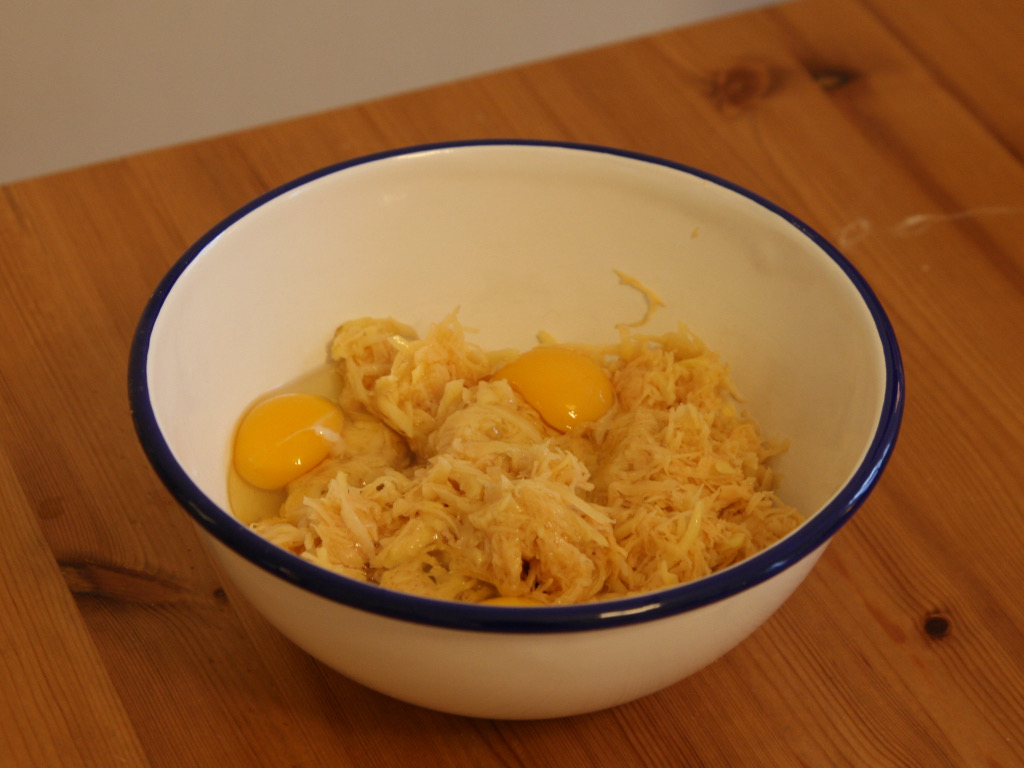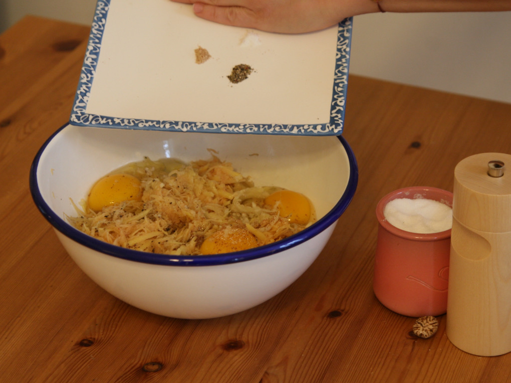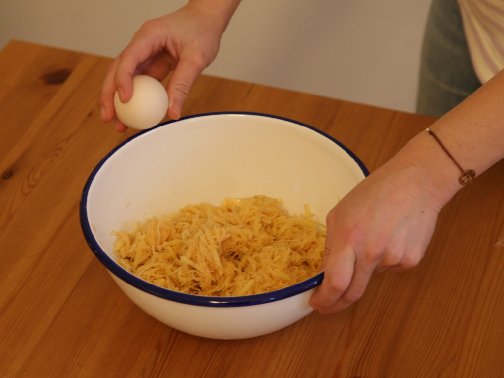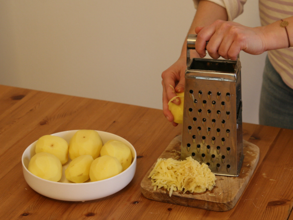 Ergreifen Sie die Reibe und reiben Sie vorsichtig eine Hälfte der rohen Erdäpfel mit der groben Seite.
