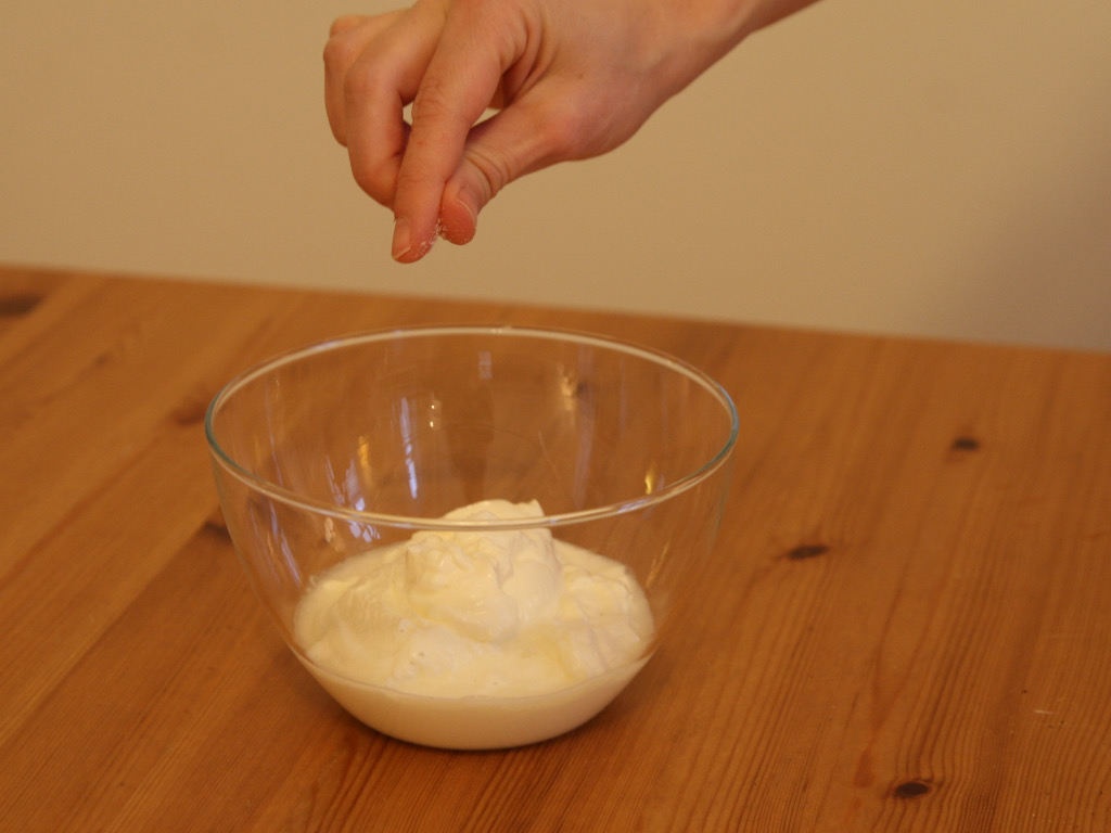 Fügen Sie 3 Gramm Salz in den Sauerrahm.