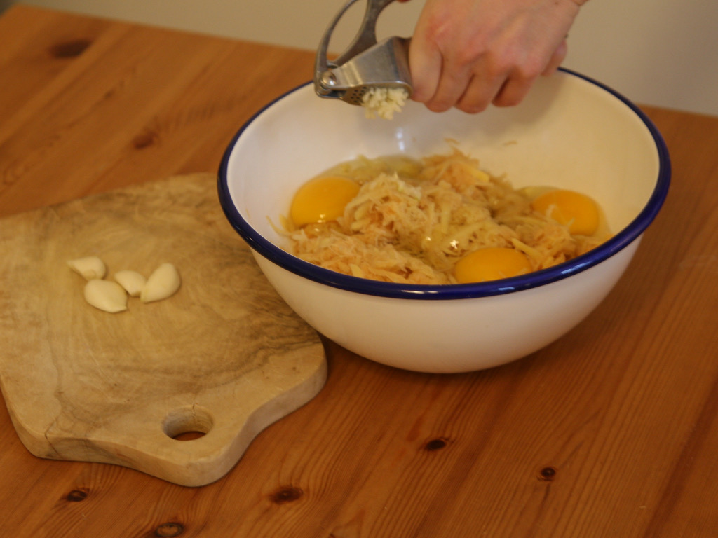 Drücken Sie die Griffe fest zusammen und pressen so den Knoblauch über der Schüssel mit der Erdäpfel-Ei-Masse aus.