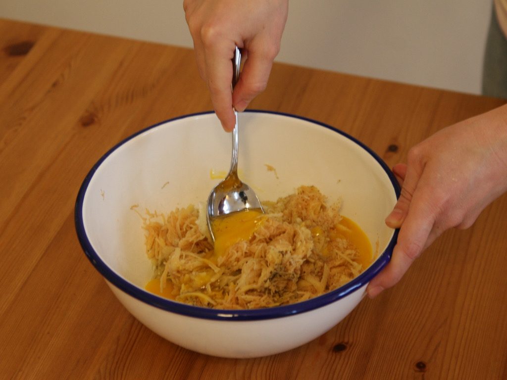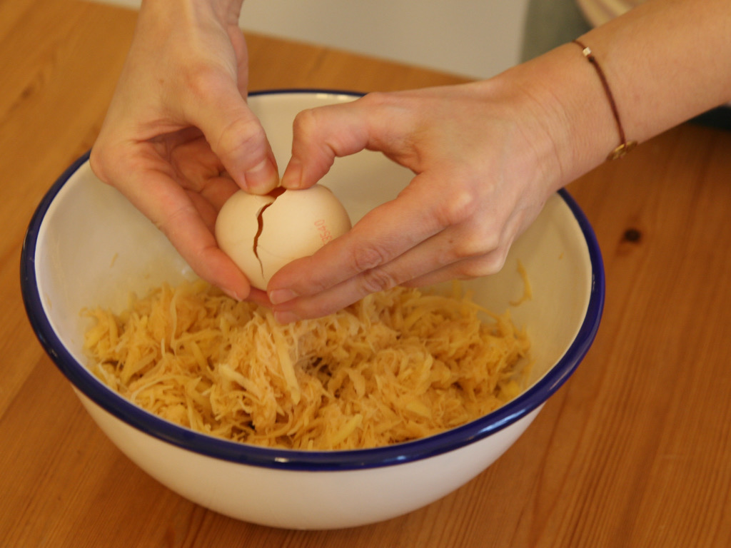 Bringen Sie das Ei schnell über die Schüssel mit der Erdäpfelmasse. Verwenden Sie beide Hände und ziehen Sie mit den Daumen die Eierschale im Riss sanft auseinander, damit das Ei in die Schüssel gleitet.