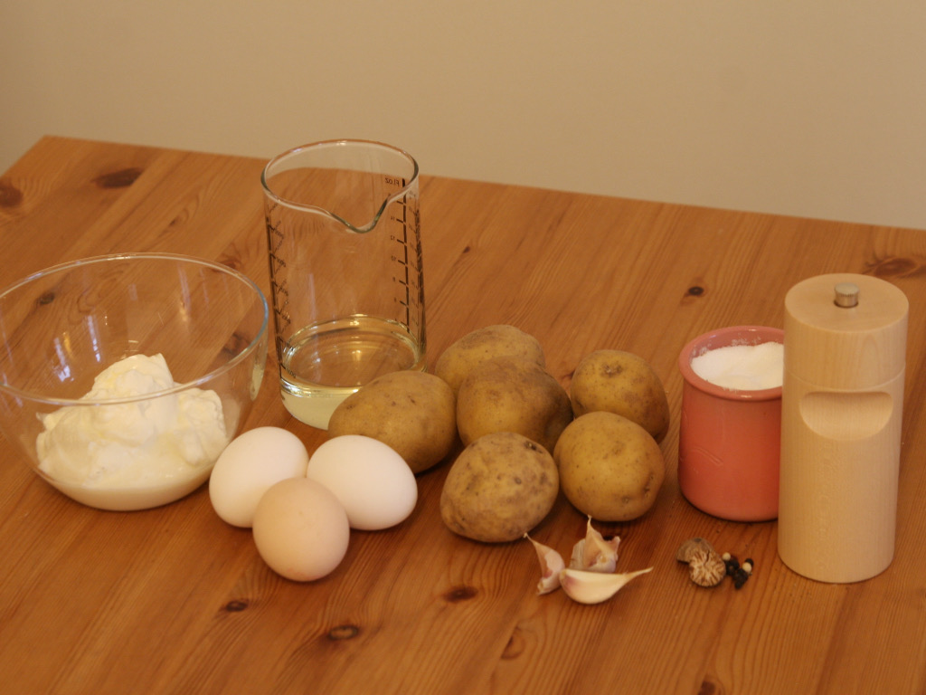 Messer, Pfannenwender, große & kleine Schüsseö, Schäler, Schneidebrett, Servietten, Reibe, Knoblauchpresse, Sieb, Esslöffel, Pfanne, Waage