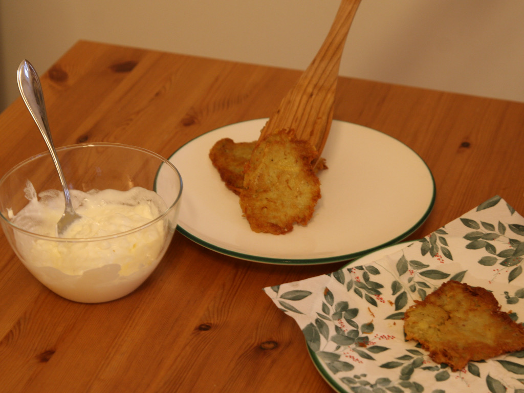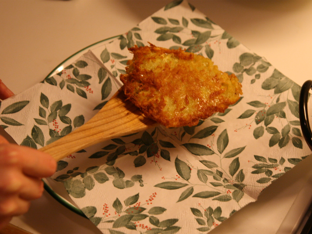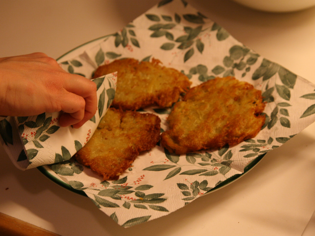 Während die Puffer braten, legen Sie eine Serviette auf einen Teller bereit.