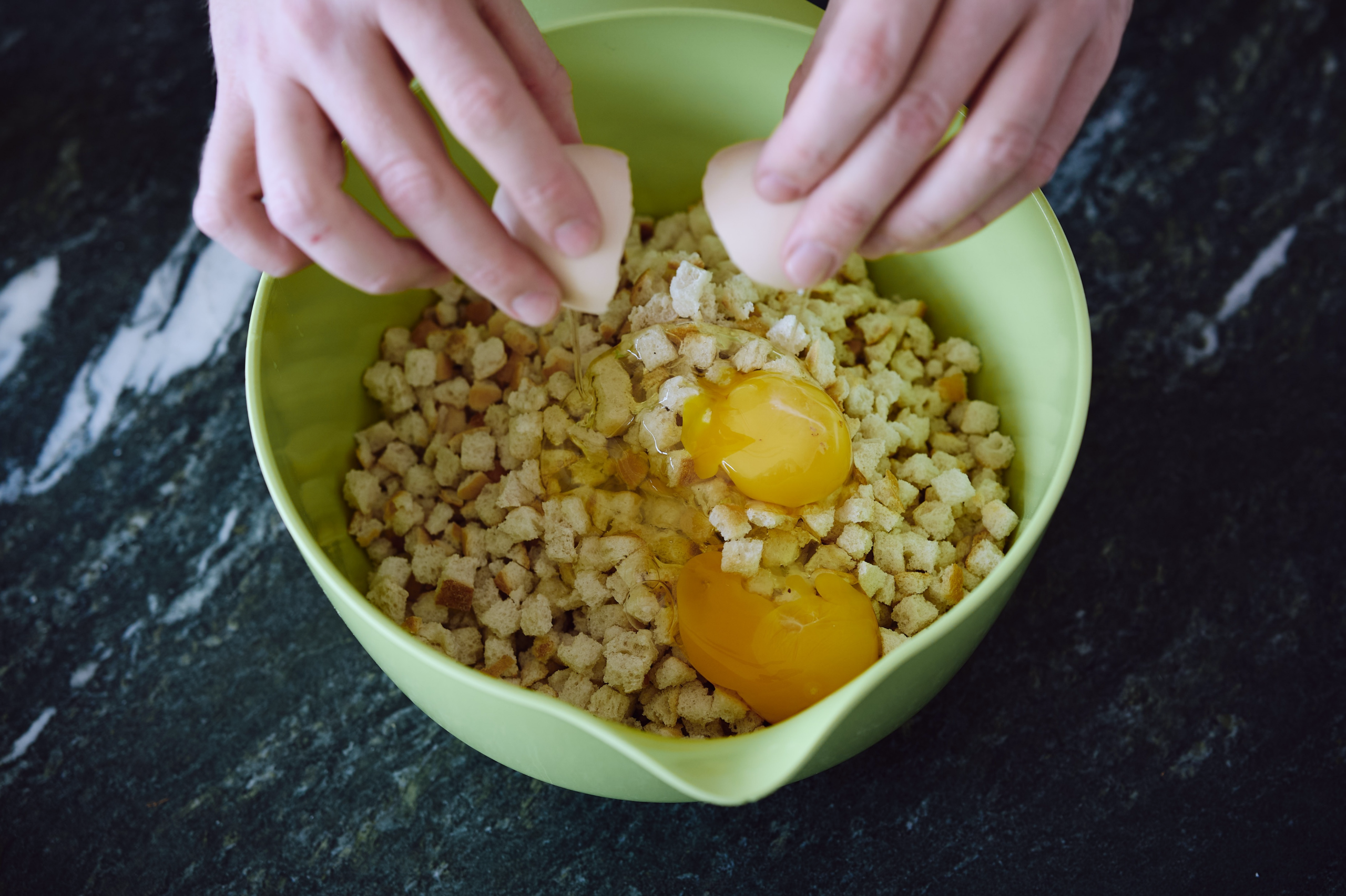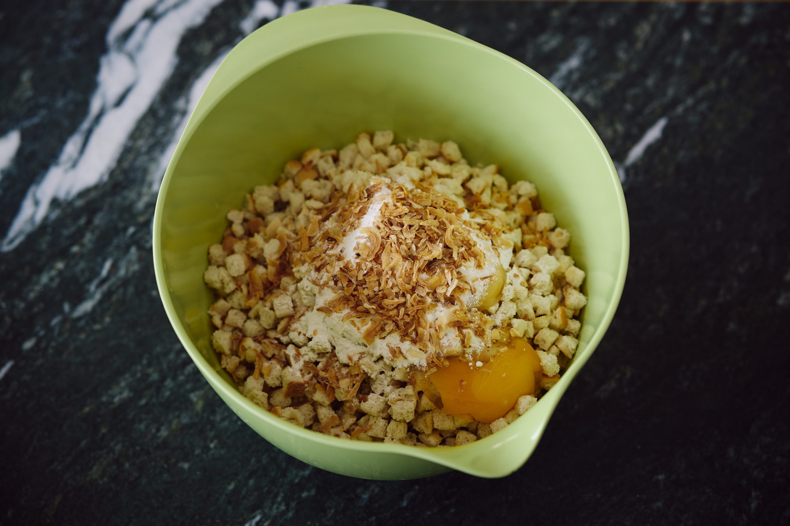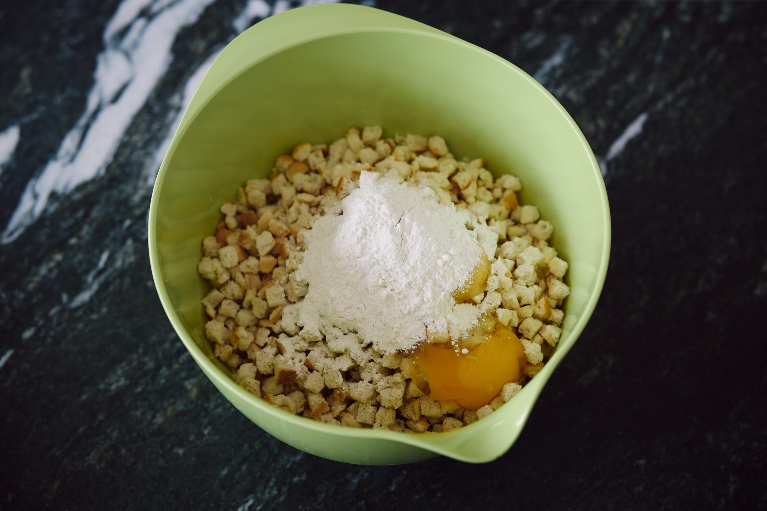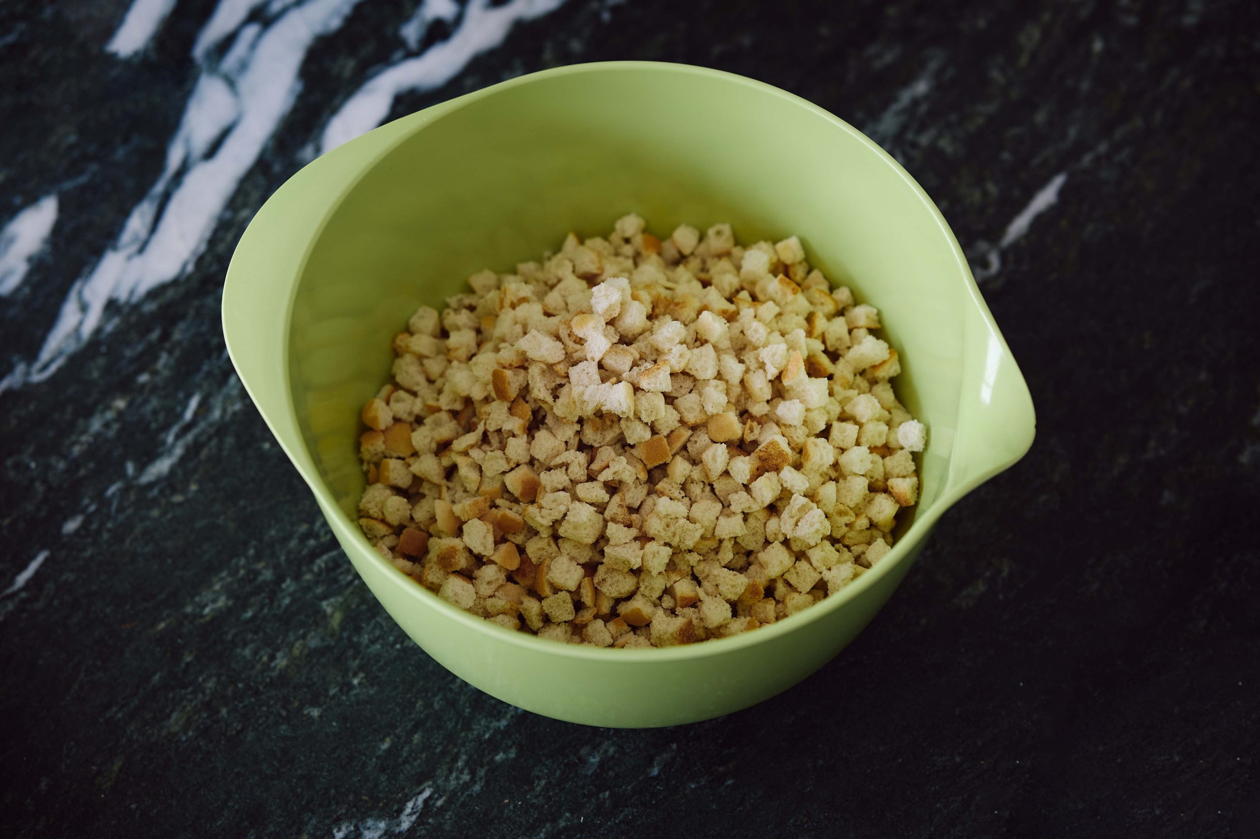 Stellen Sie die Schüssel auf die Waage und geben Sie 170g Semmelwürfel dazu.