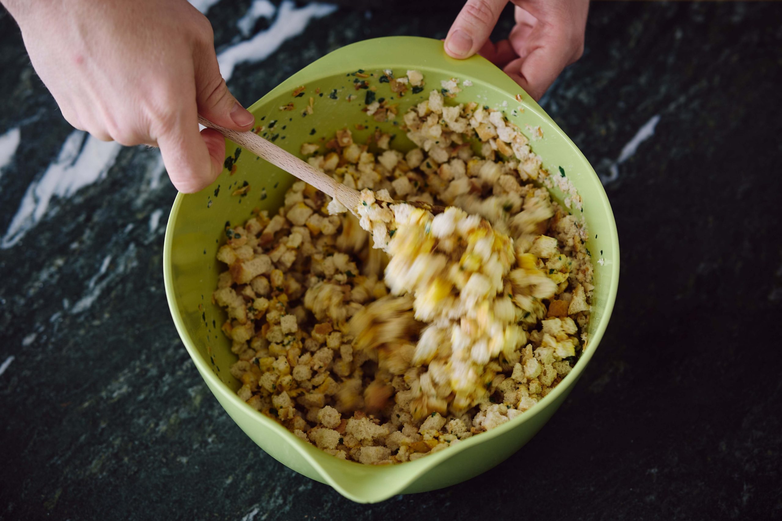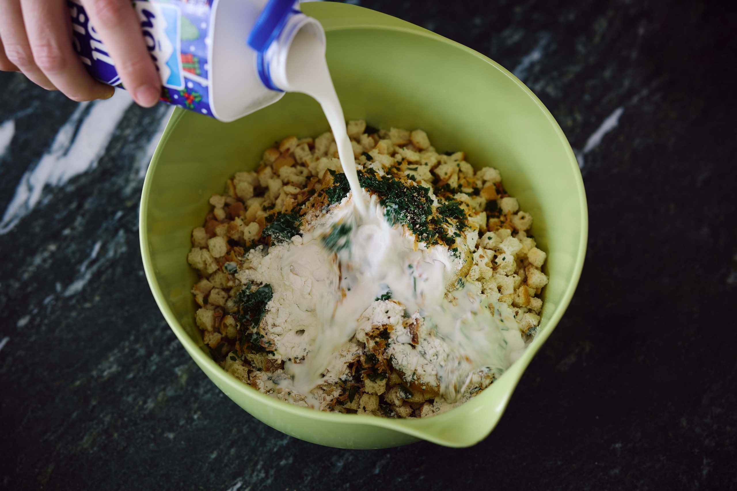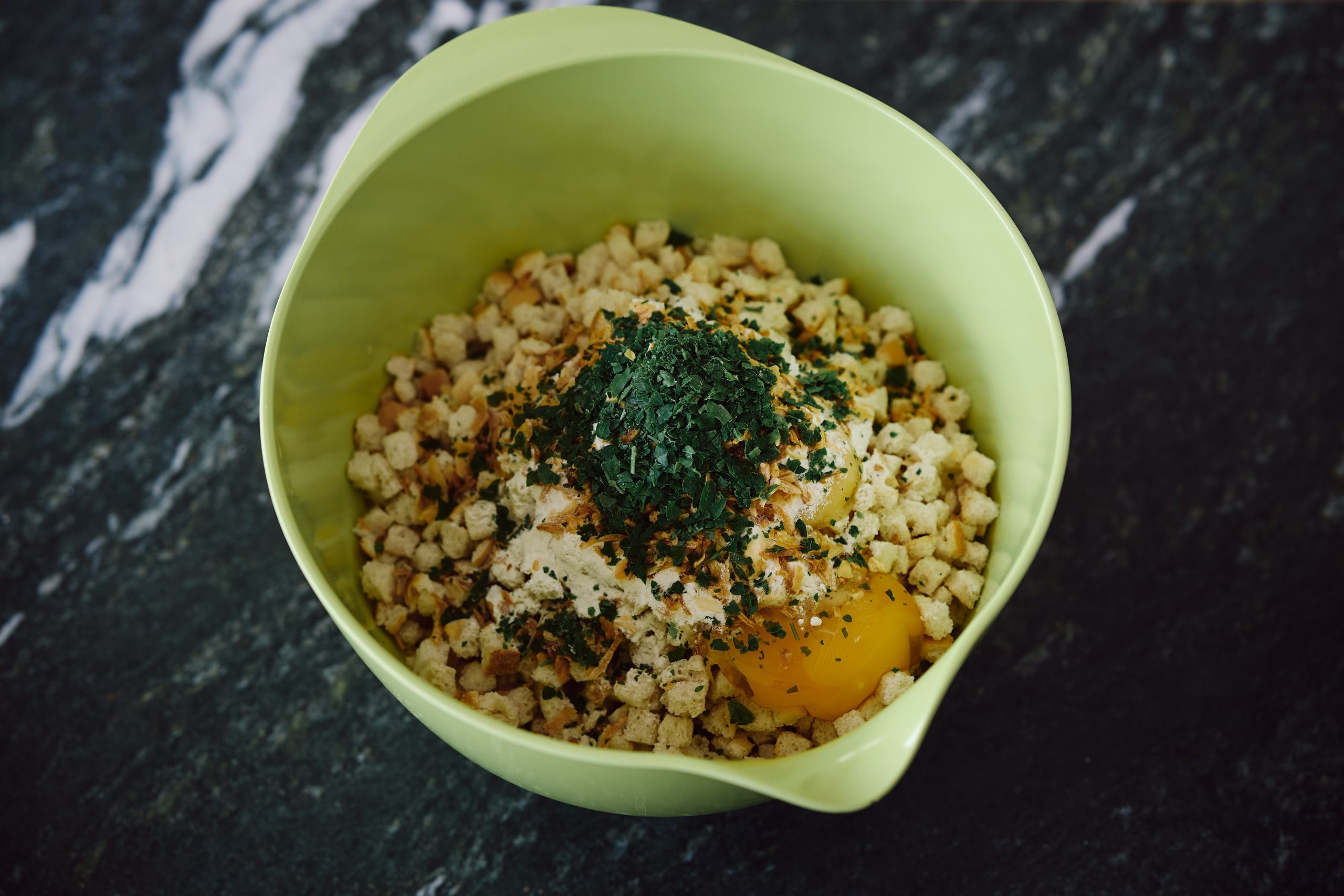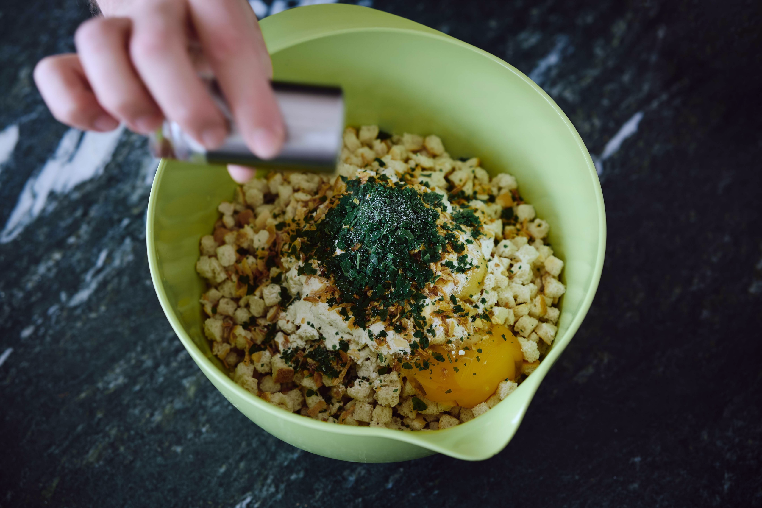 Stellen Sie die Schüssel auf die Waage und geben Sie 170g Semmelwürfel dazu.