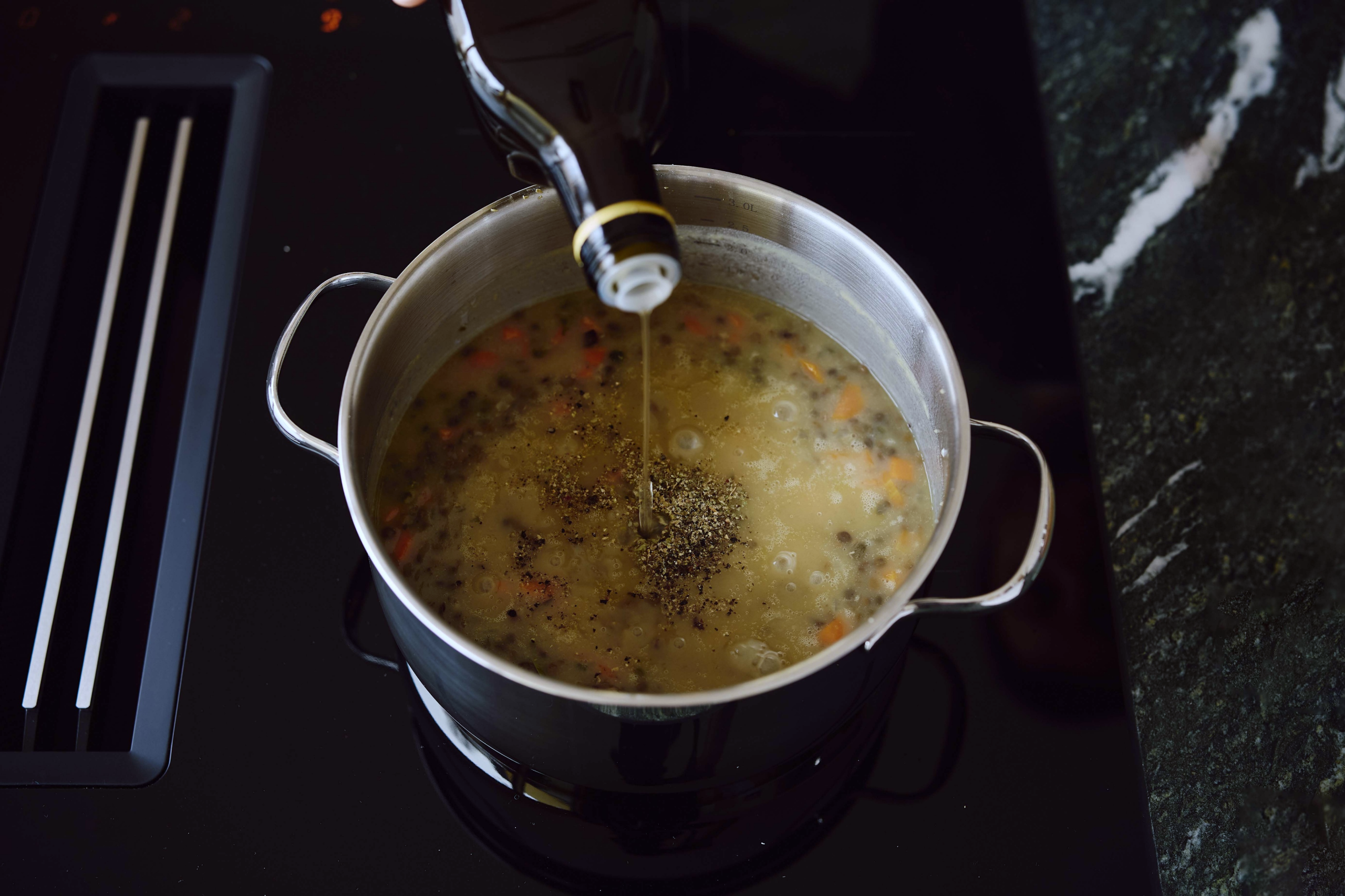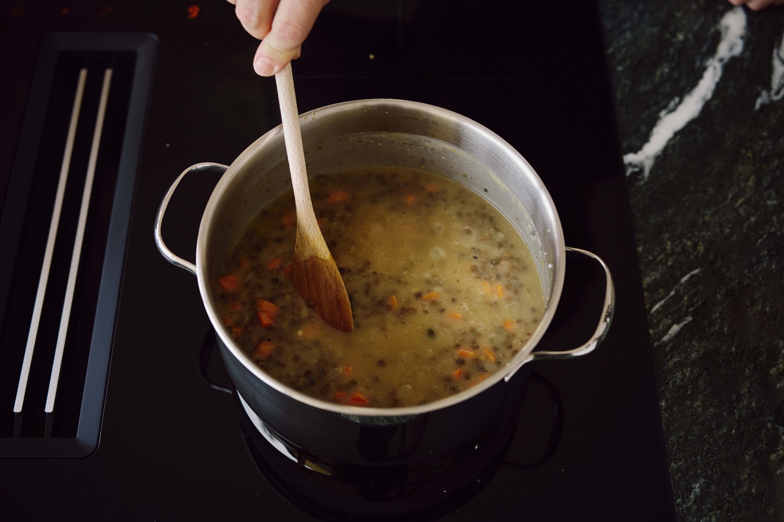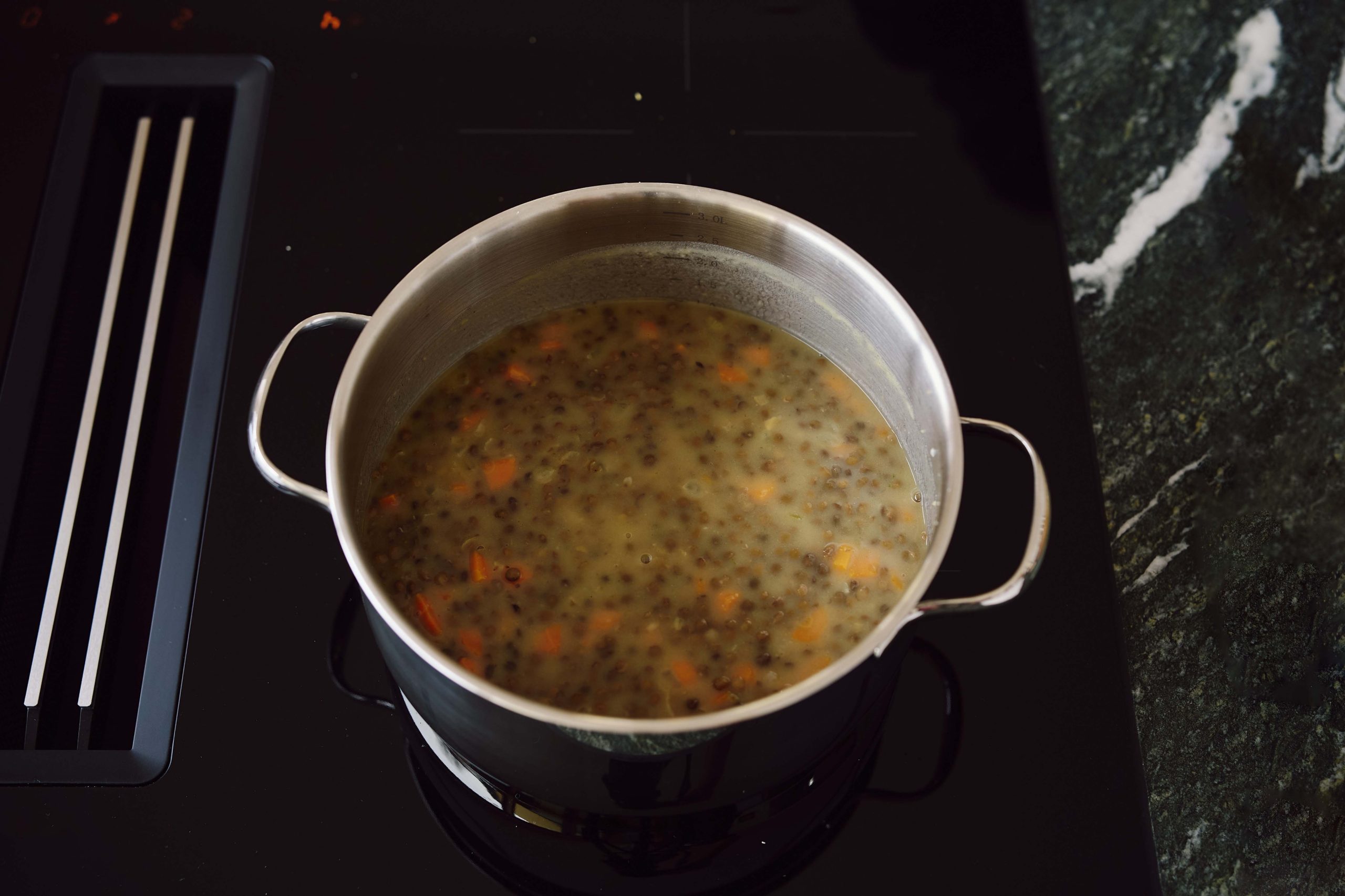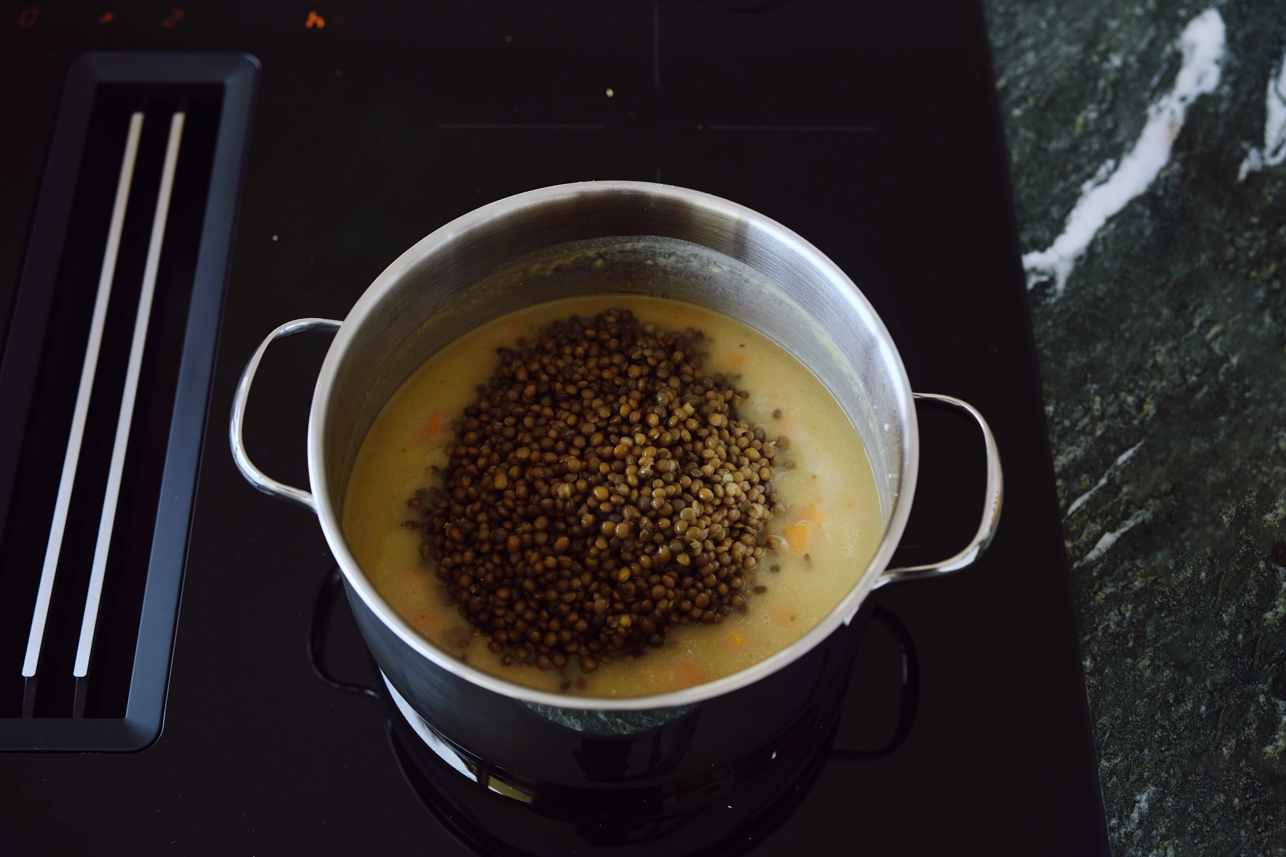 Öffnen Sie die Linsen, geben Sie sie in ein Sieb, lassen Sie sie abtropfen und geben Sie sie anschließend in den Kochtopf.