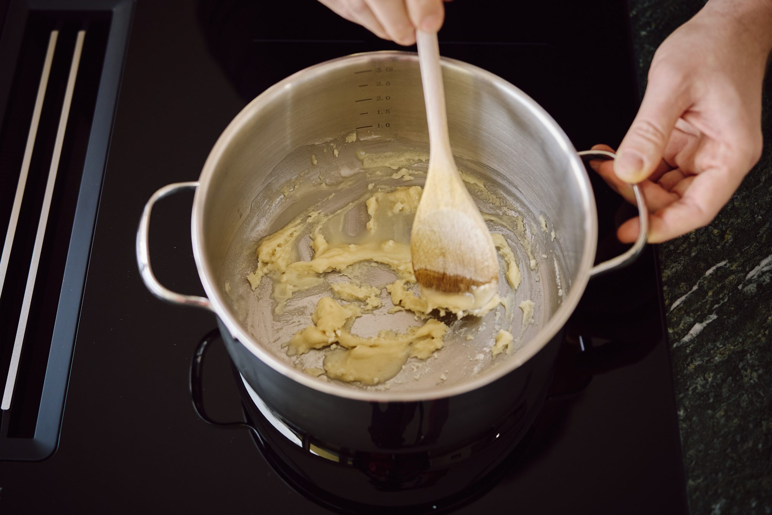 Nun das Mehl anrösten bis es leicht bräunlich wird, dafür laufend umrühren.