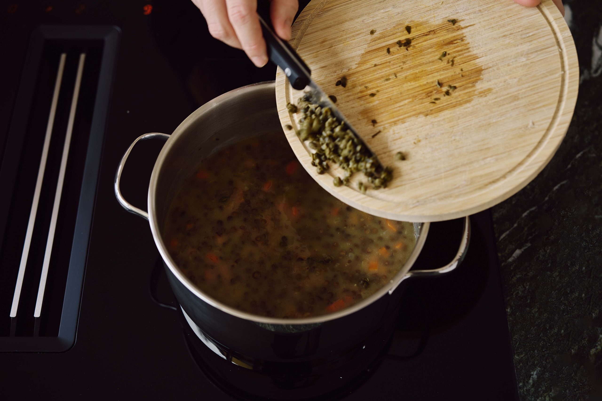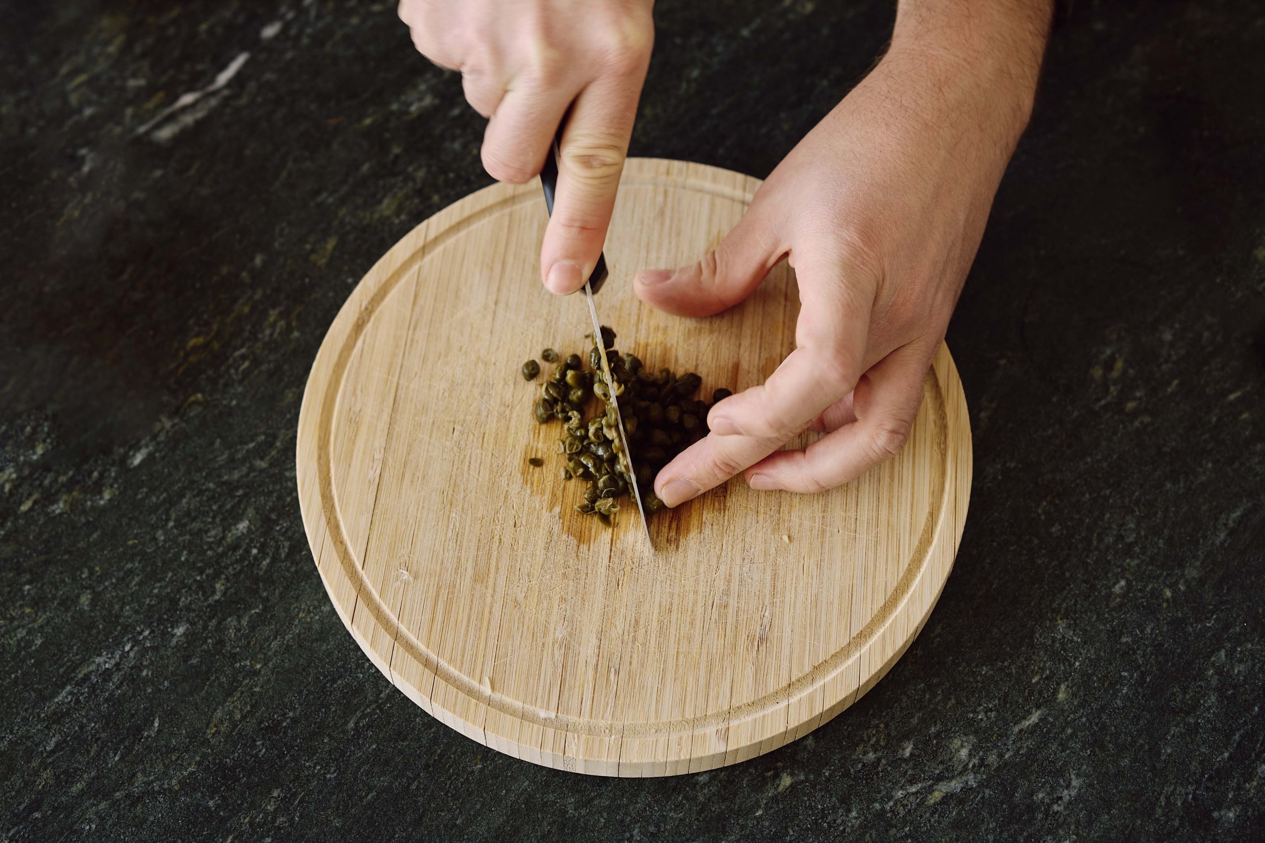 Wiegen Sie 15g Kapern ab und schneiden Sie die Kapern mit dem Messer in kleine Stücke.