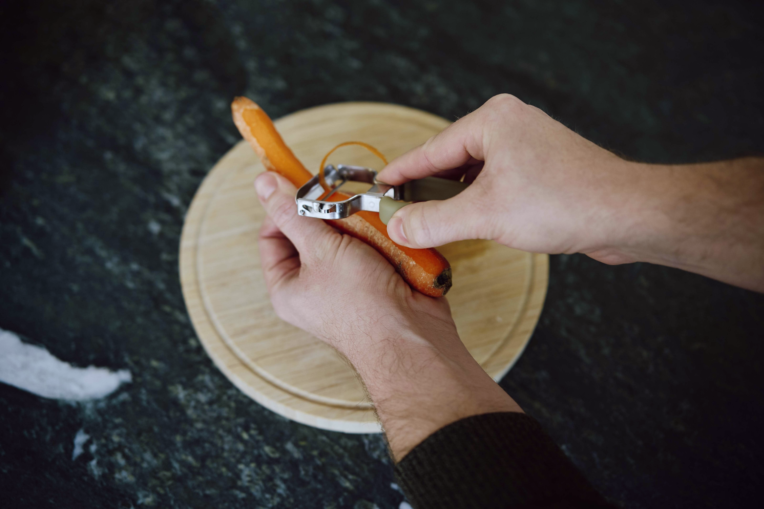 Schälen Sie die Karotten mit einem Schäler. Halten Sie dazu die Karotte mit Ihrer nicht dominanten Hand und den Schäler mit Ihrer dominanten Hand.