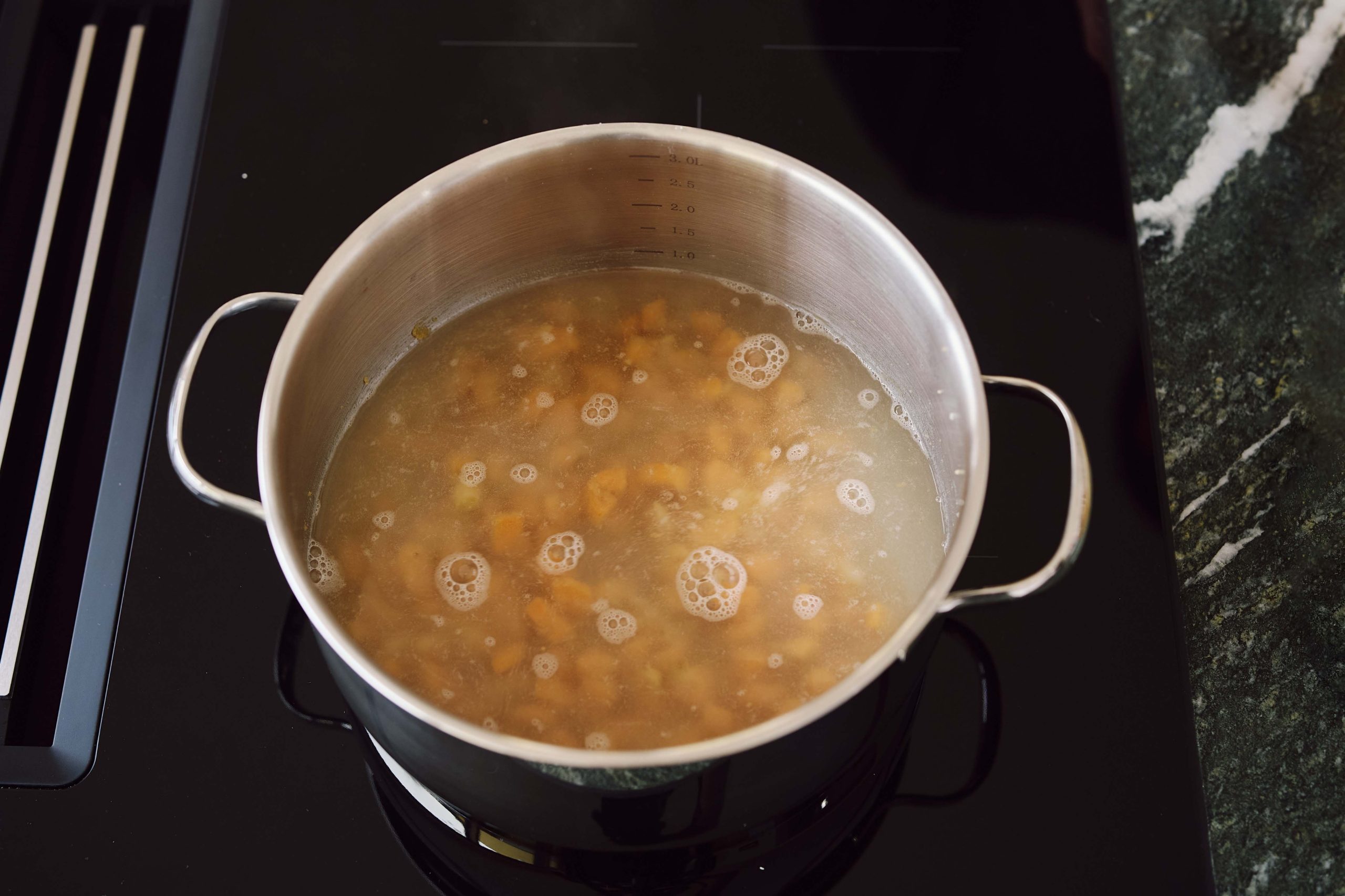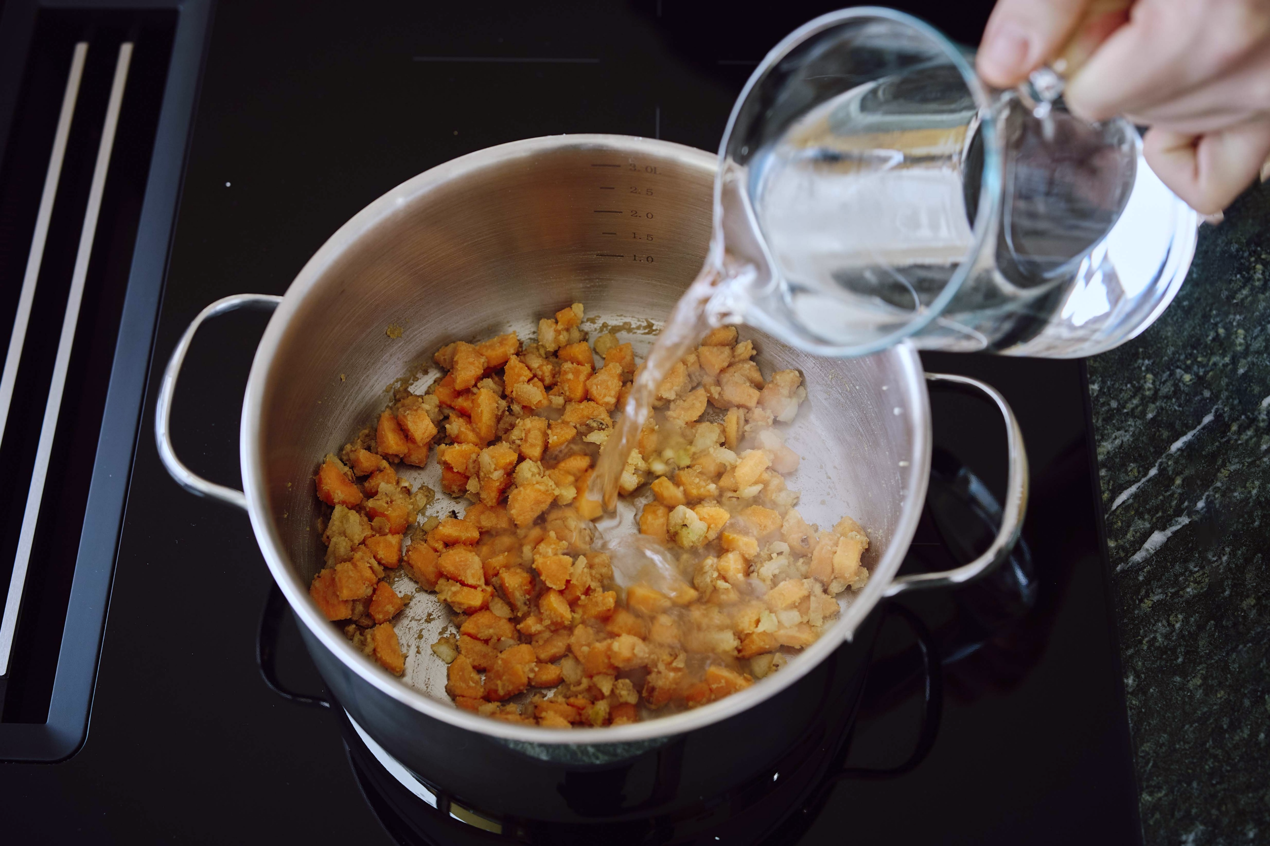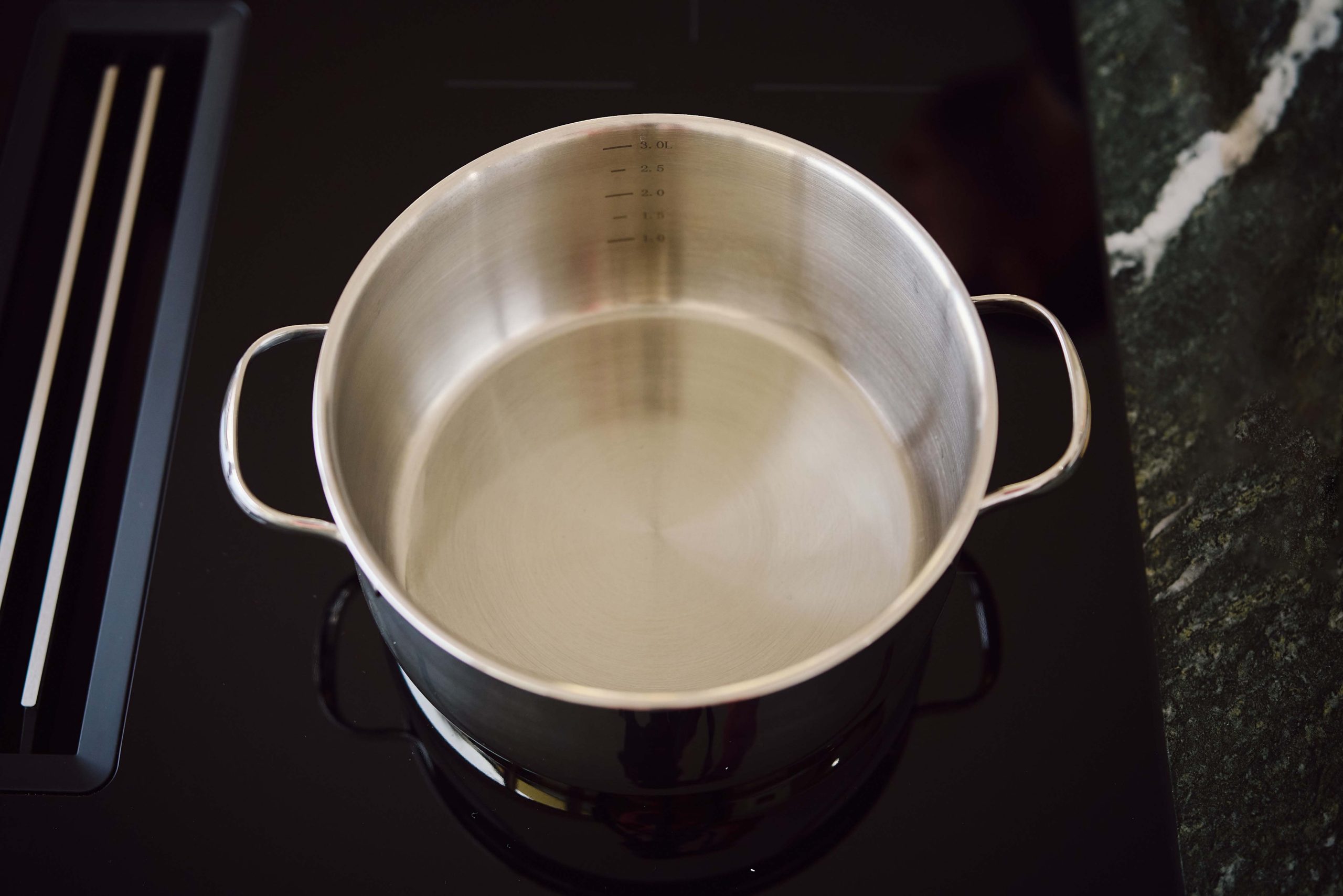 Geben Sie 500 Gramm Wasser in den Topf.