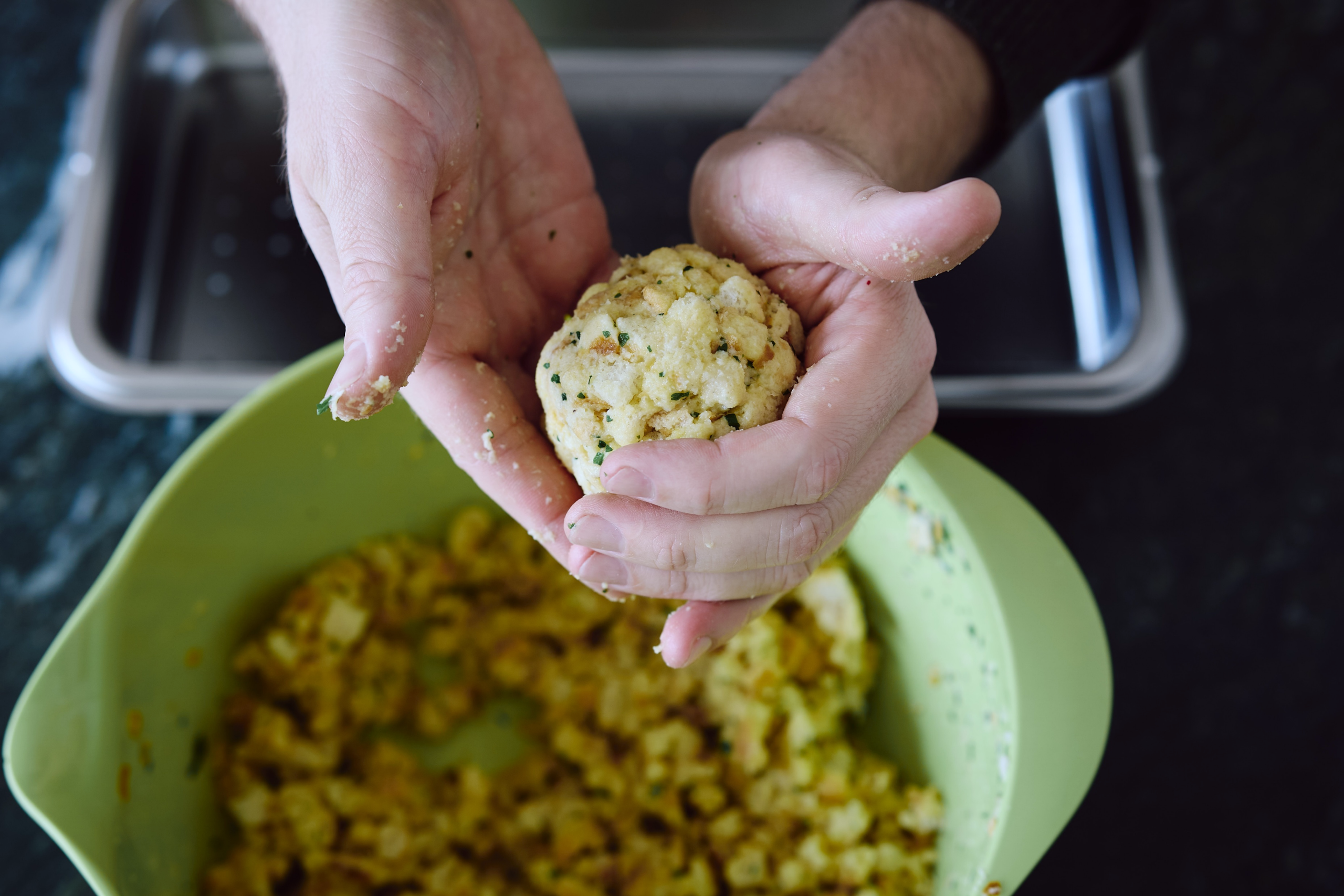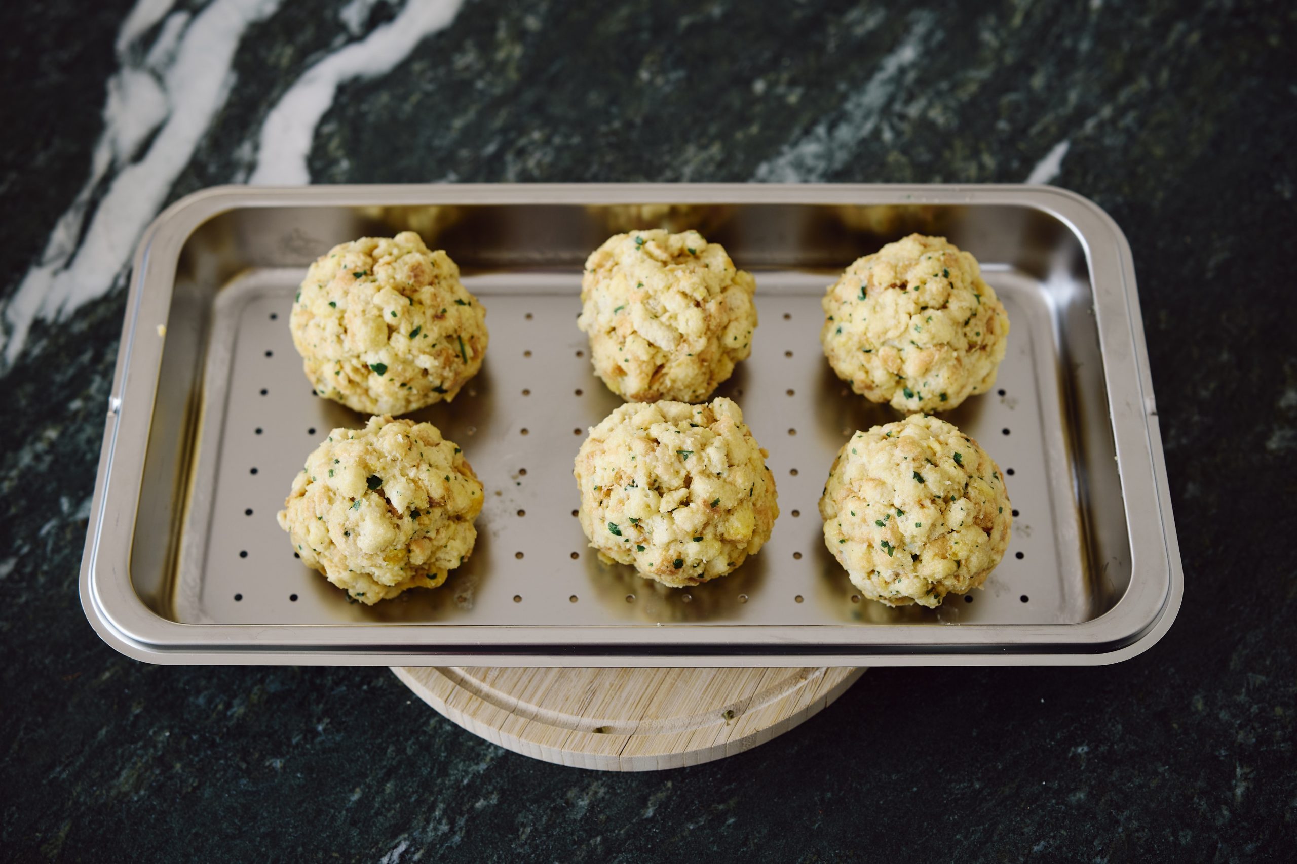 Nehmen Sie 90g der Masse und formen Sie die Knödel mit Ihren Händen.