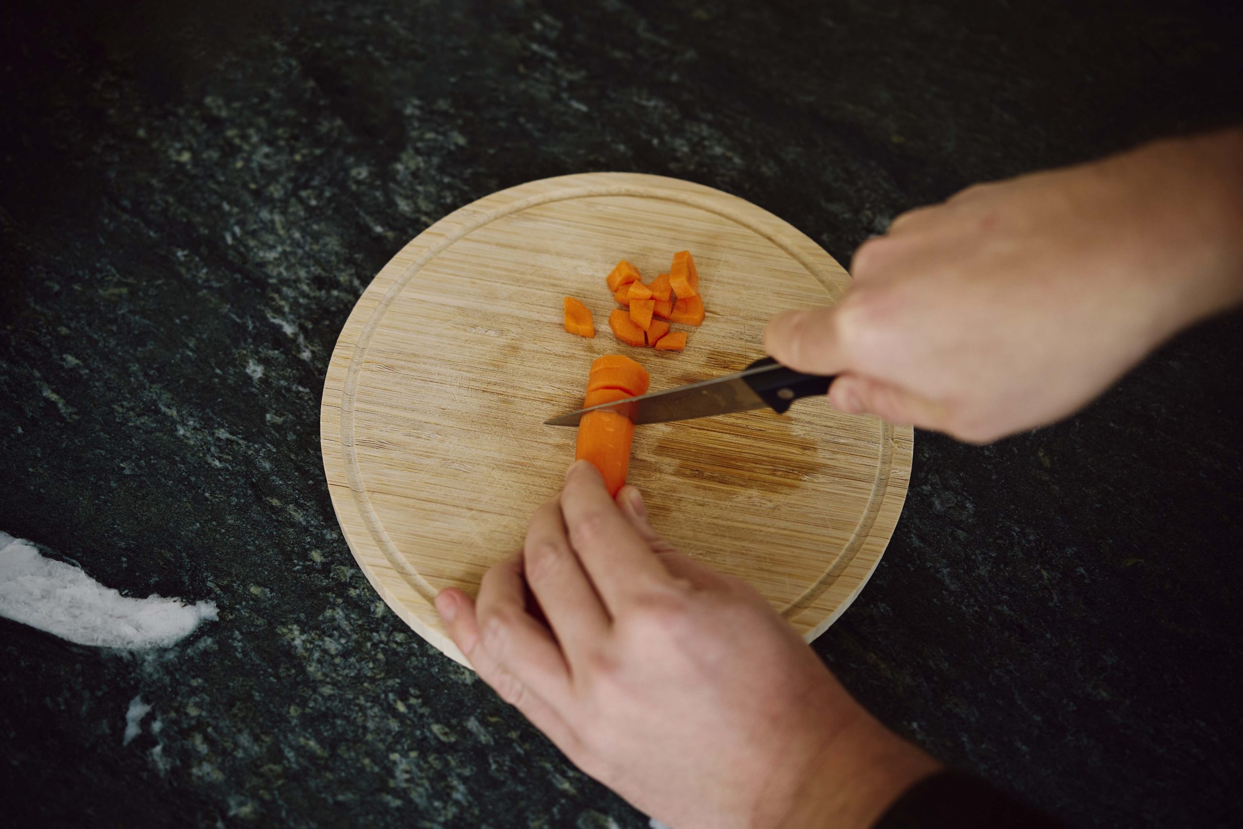 Schneiden Sie die Karotten mit dem Messer in kleine Stücke.