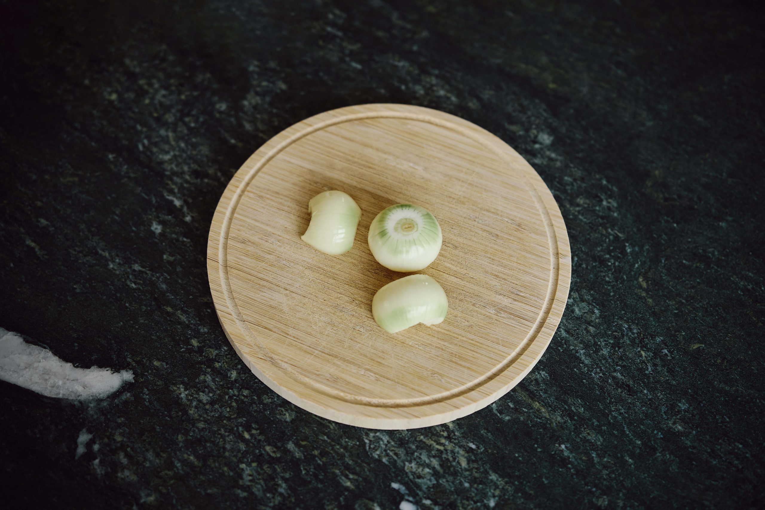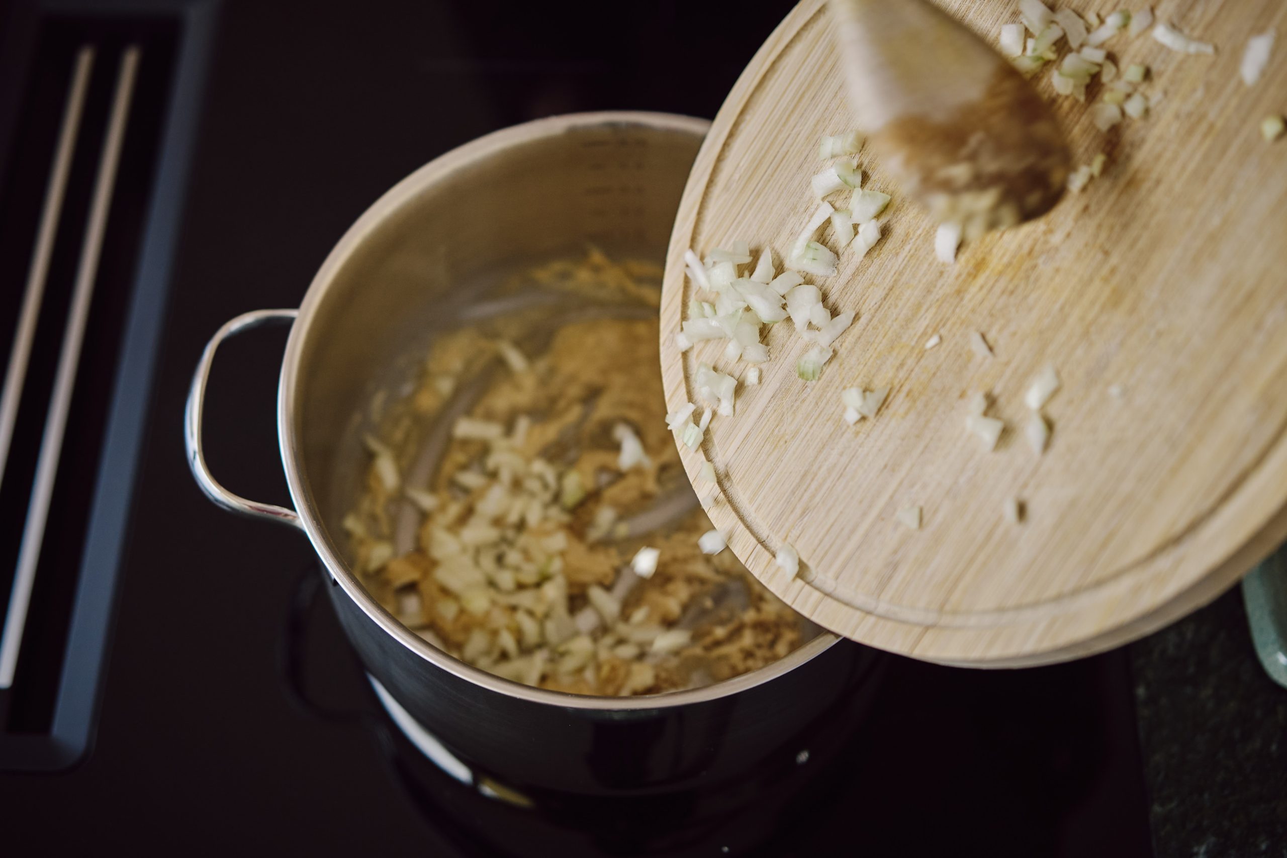 Schneiden Sie die Zwiebel mit einem Messer in kleine Stücke.