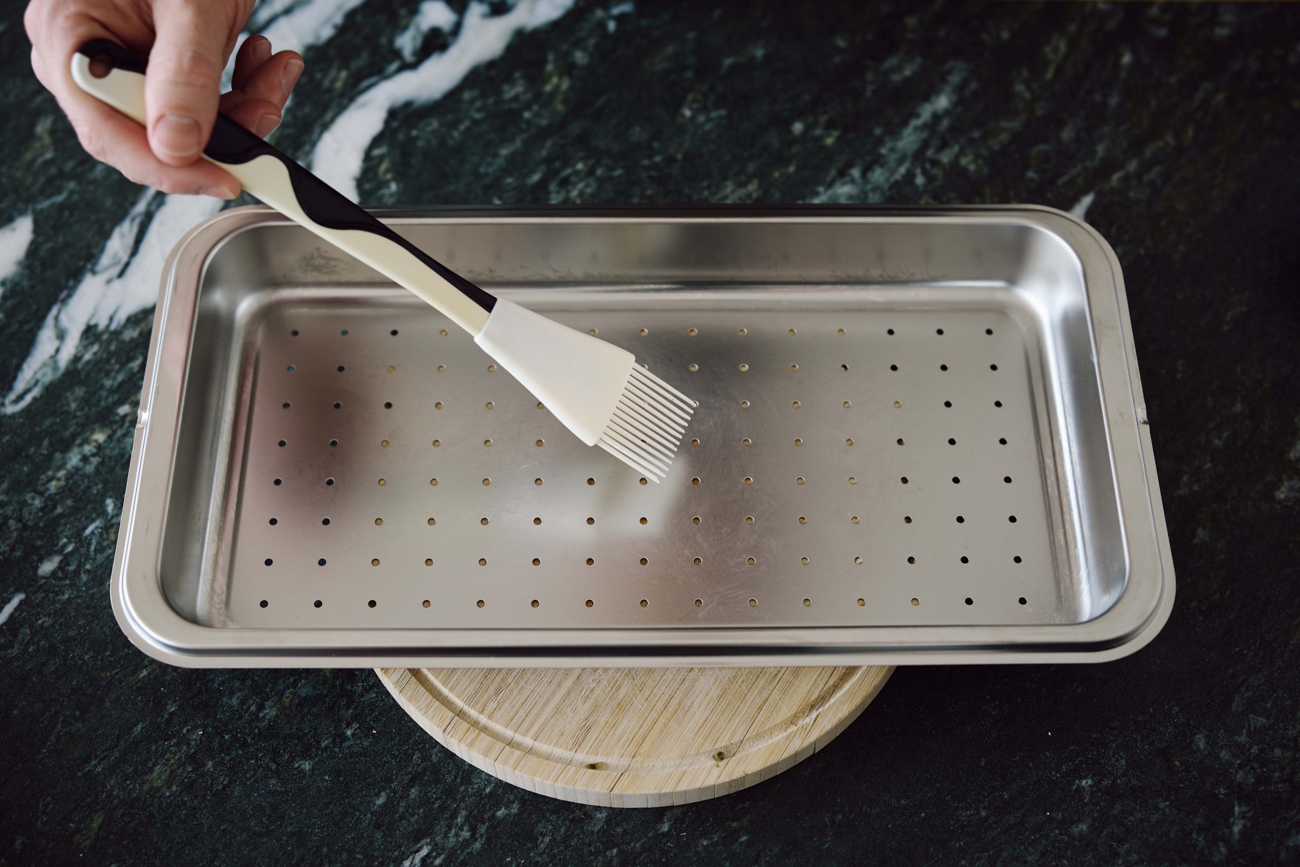 Schieben Sie das Blech in den Dampfgarer und lassen Sie es für 20 Minuten auf 100° garen. Danach nehmen Sie das Blech aus dem Dampfgarer.