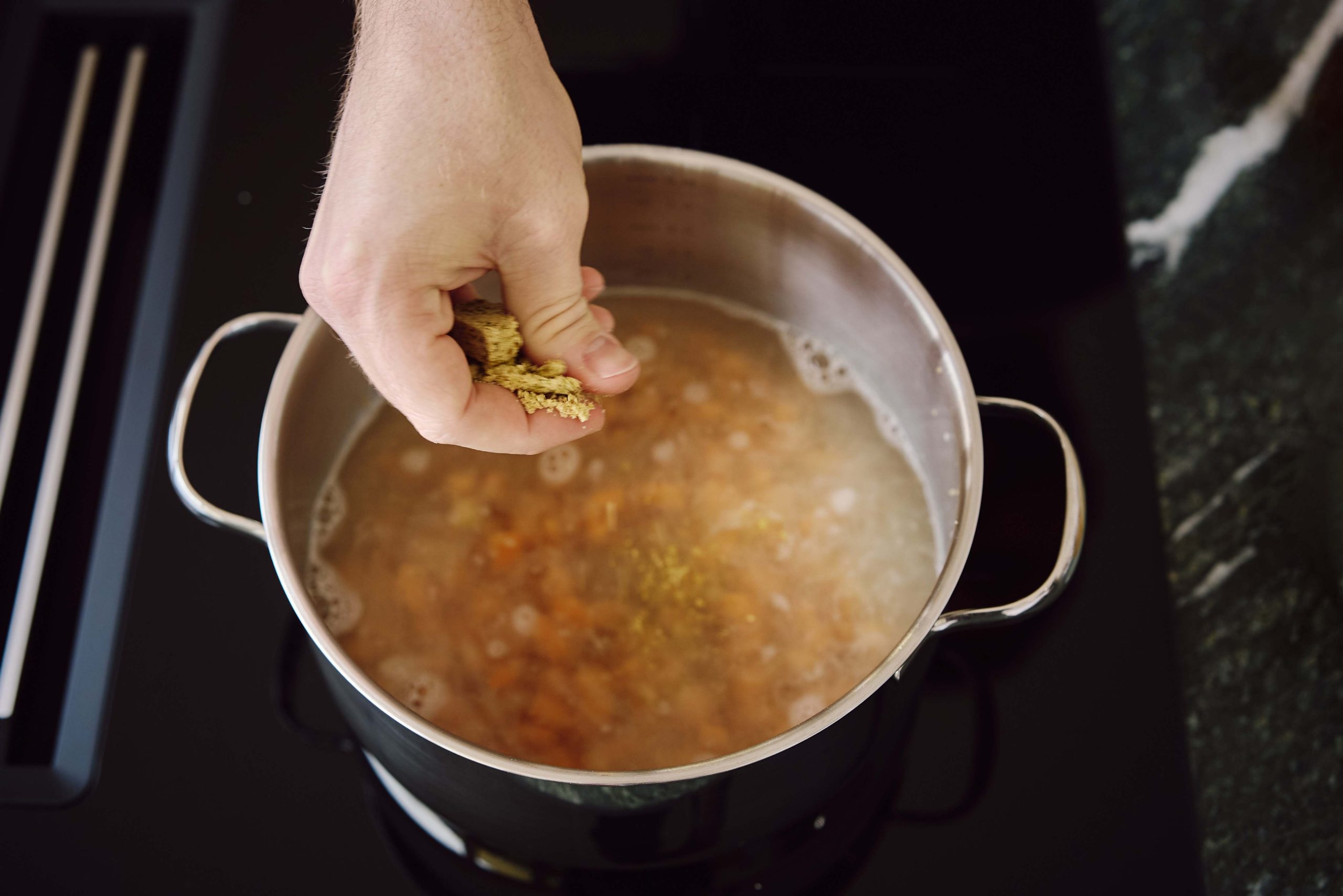 Geben sie den Suppenwürfel hinzu, indem Sie ihn mit den Fingern über dem Topf verkleinern.