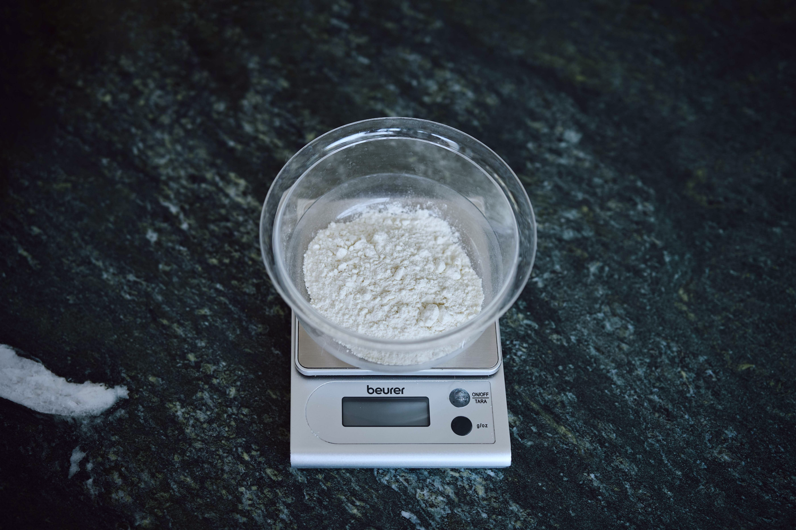 Stellen Sie eine Schüssel auf die Waage und wiegen Sie 30g Mehl ab.